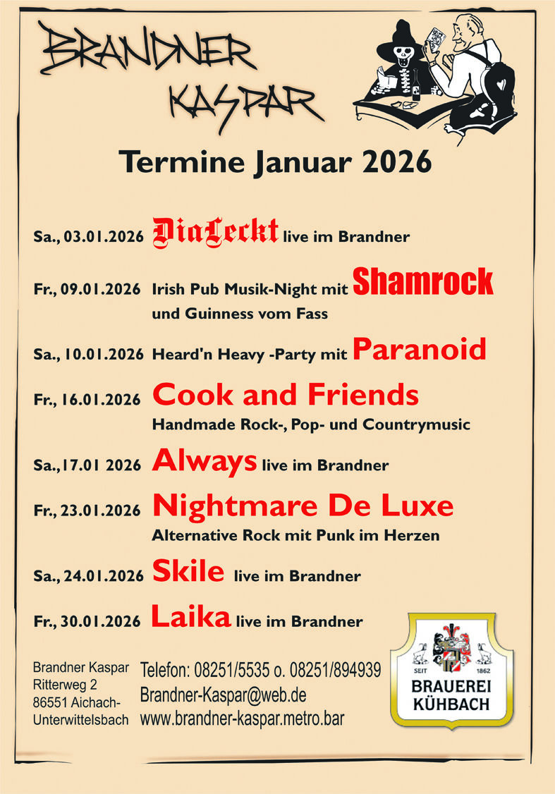 Am 24.01.2026 gibt's in der legendären Musik-Kneipe "Brandner Kaspar" in Aichach eine fette Rock Party mit der Liveband SKILE!